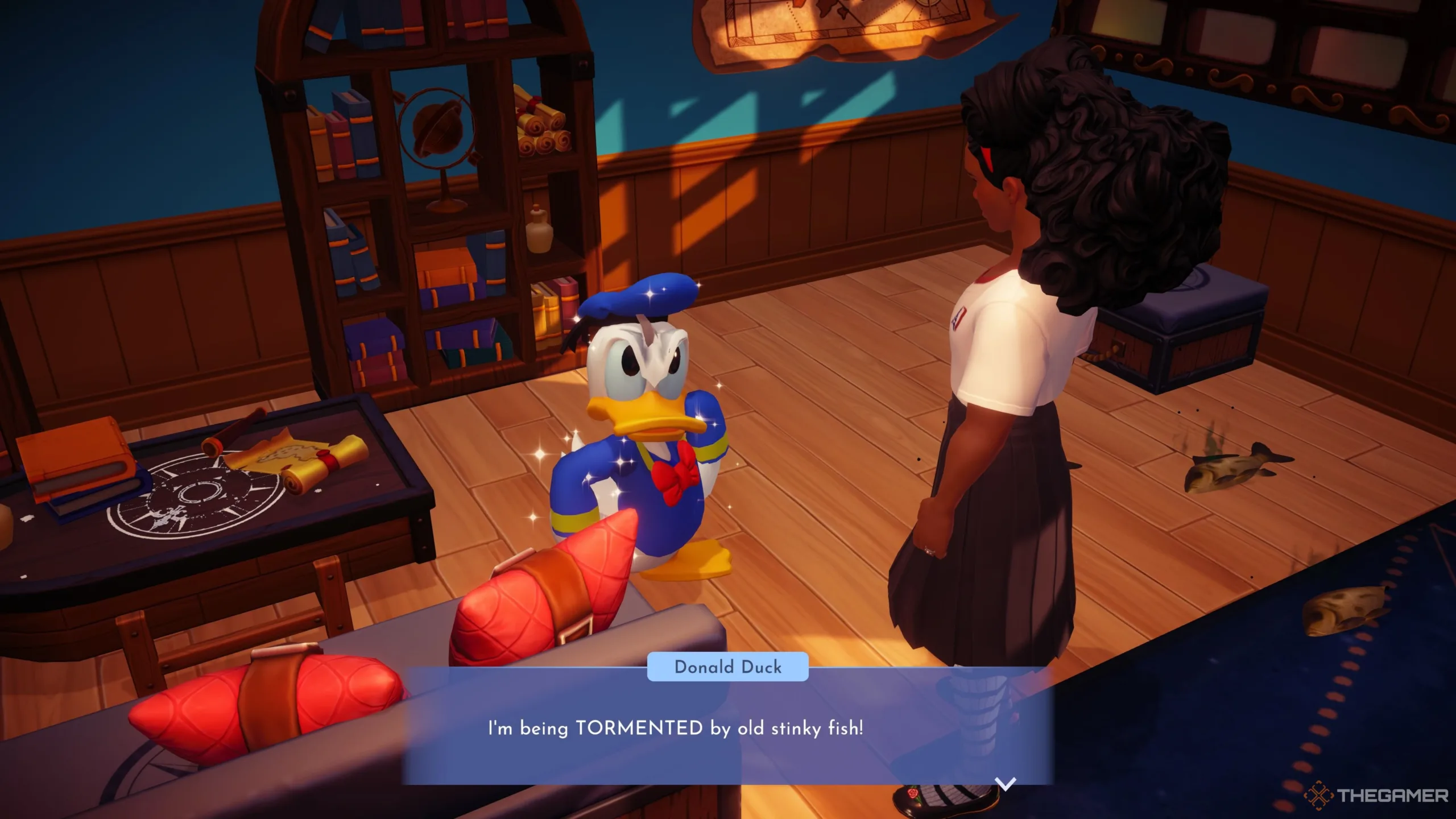 Once you’ve met these requirements, talk to Jasmine. She will direct you to Donald Duck, so you’ll want to enter his house and have a chat with him. After that talk, gather the 15 Stinky Fishes scattered around his room and then speak with him again.