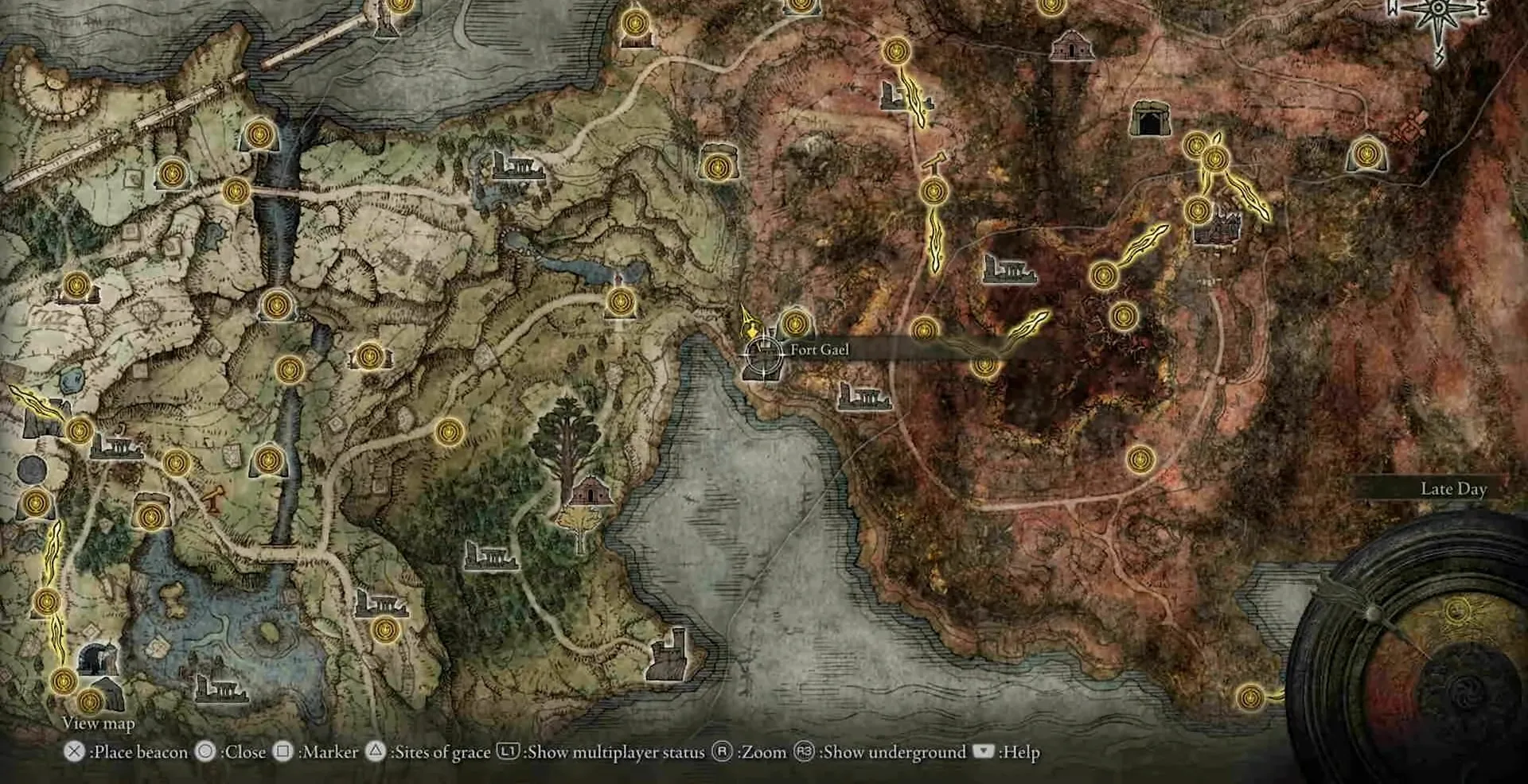 This fort is located in the southwest area of Caelid, close to the northern Limgrave border. As the entrance gate to Fort Gael is locked, navigate around it until you spot a ladder near a tree that leads into the fort through a damaged rampart.