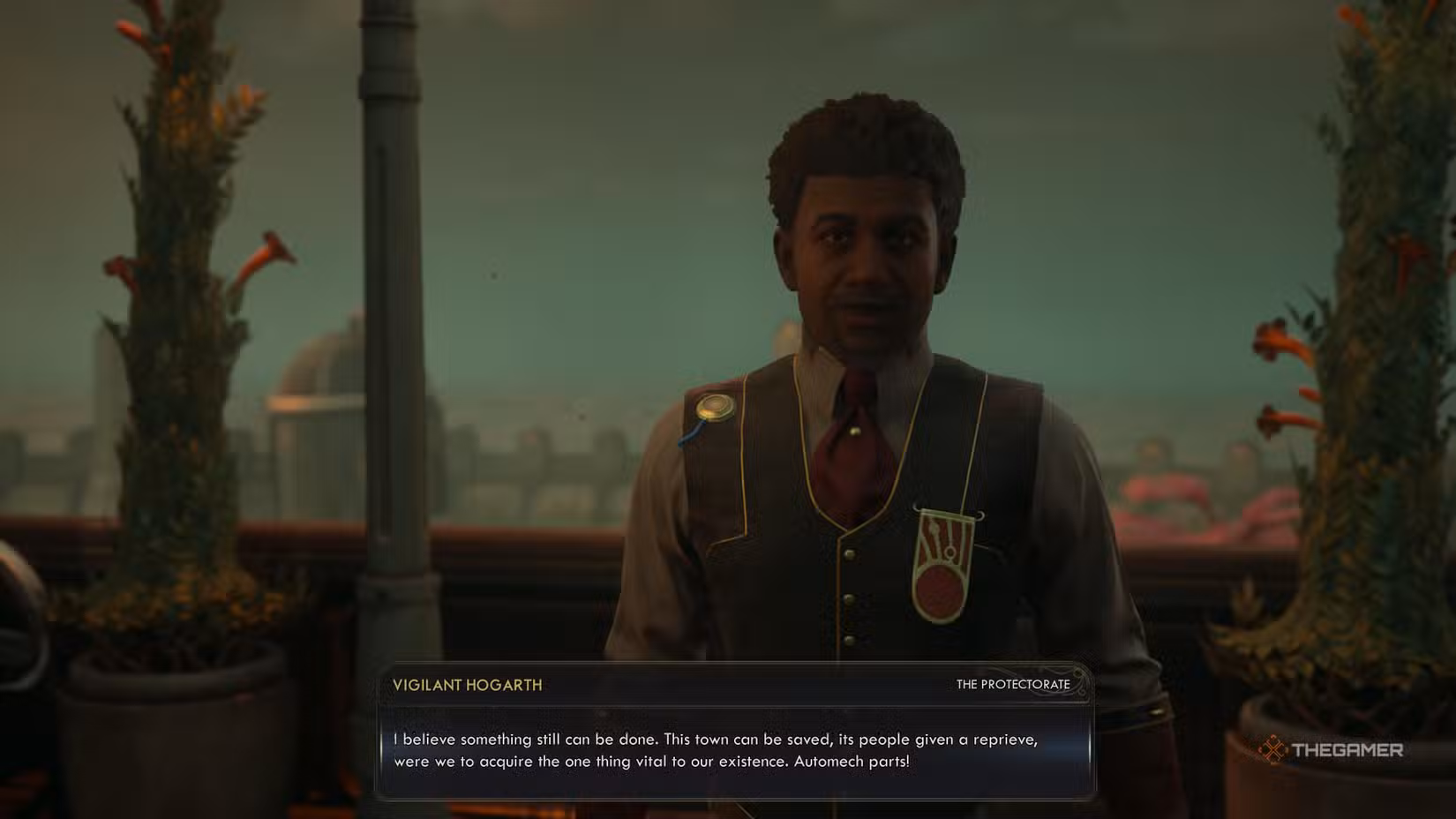 Inside the city, the biggest building in the back is Hogarth’s residence. The city isn’t off-limits, and nothing is owned, so feel free to pick up items along the way. On the second floor, you’ll find Hogarth on a balcony with his automech. Unlike most Protectorate residents, Hogarth is more welcoming because he feels abandoned by the authorities. Despite Westport’s hardships, Hogarth refuses to give up and wants to restore the city’s former glory.