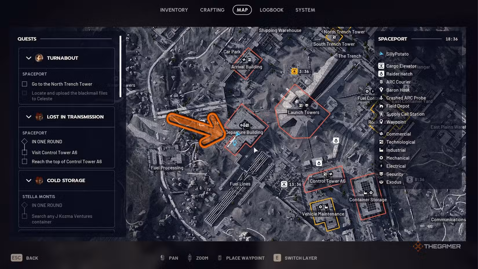Once you accept “The Stench of Corruption,” your first objective is to reach the southwest entrance of the Departure Building at Spaceport. You can identify this building by looking for red outlines near the center of the map. Head to the smaller southwest section of the building to find the entrance.