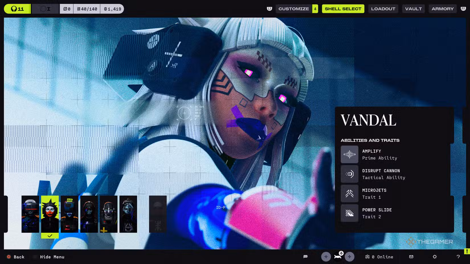 Their prime ability boosts your movement and aiming skills and lowers your heat production. Vandal also carries a cannon that pushes enemies back when struck. Managing heat can be difficult early on, but if you master agility, this Shell is great for flanking and quick escapes.