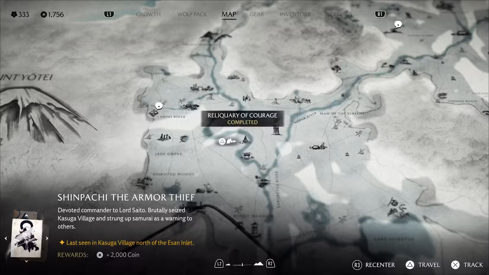 The Reliquary of Courage is near the beginning of Yotei’s story in the Yotei Grasslands. It’s almost directly west of Yotei’s Shadow Inn, which is likely one of your first stops. The reliquary sits by a river, with its wolf pedestals scattered among nearby bushes. The riddle for this reliquary reads: