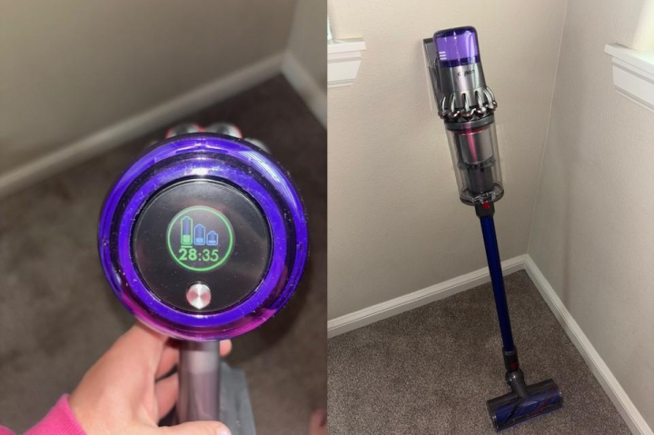The Dyson V11 immediately feels high-end. I love the deep blue color and the digital display on the back. It’s not a touchscreen, but it looks sleek and provides helpful info about battery life and cleaning modes.