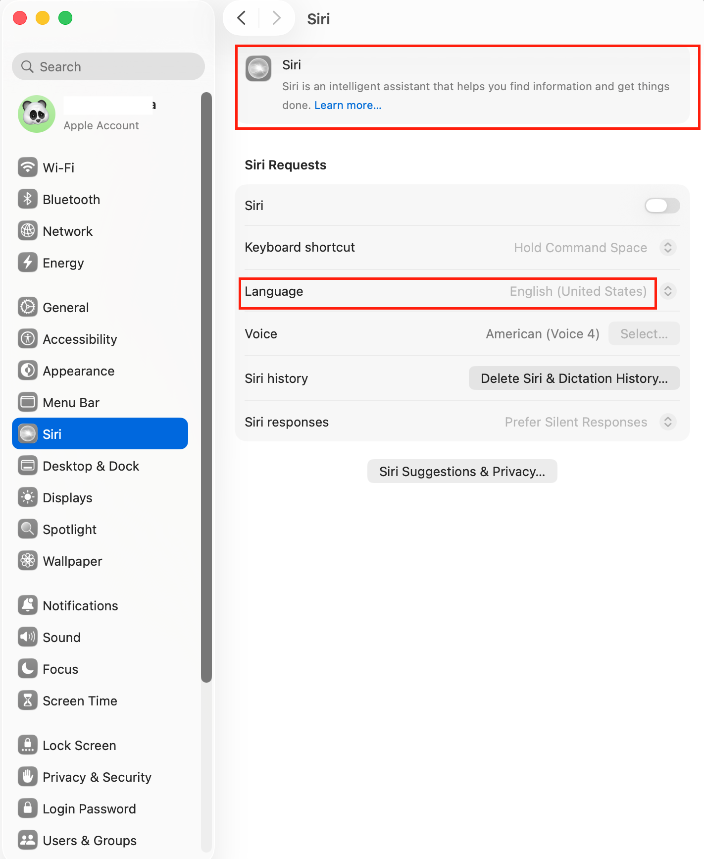 Next, check the Siri settings. Ensure that Siri’s language is also set to “English (US).” If it’s not, update it and restart your Mac again.