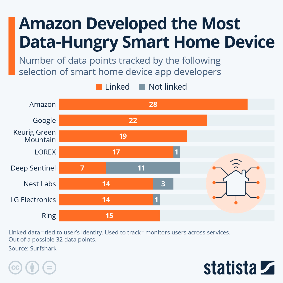 Perhaps the most unexpected entry in the list of data-hungry devices is Keurig’s coffee machine app. In total, this app collects 19 data points, including eight that enable tracking across third-party networks. Besides serving coffee enthusiasts, this app also incorporates an online shopping function, which accounts for some of its data collection metrics. This diversification shows how even seemingly innocuous devices can participate in the broader data economy.