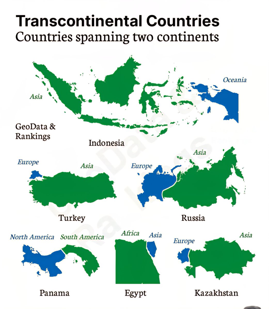 Note: These countries are classified as transcontinental based on widely accepted geographic definitions. However, classifications can vary, especially for nations like Indonesia and Armenia, where debates about continental boundaries continue to exist in academic and geopolitical discussions.