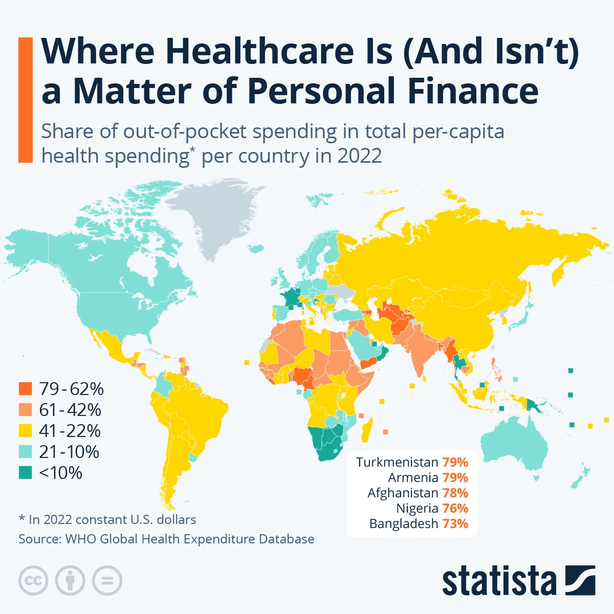 Conversely, certain countries report alarmingly high levels of out-of-pocket expenditure. In thirteen countries and territories, this spending exceeds two-thirds of the total health expenditures. Notable examples include: