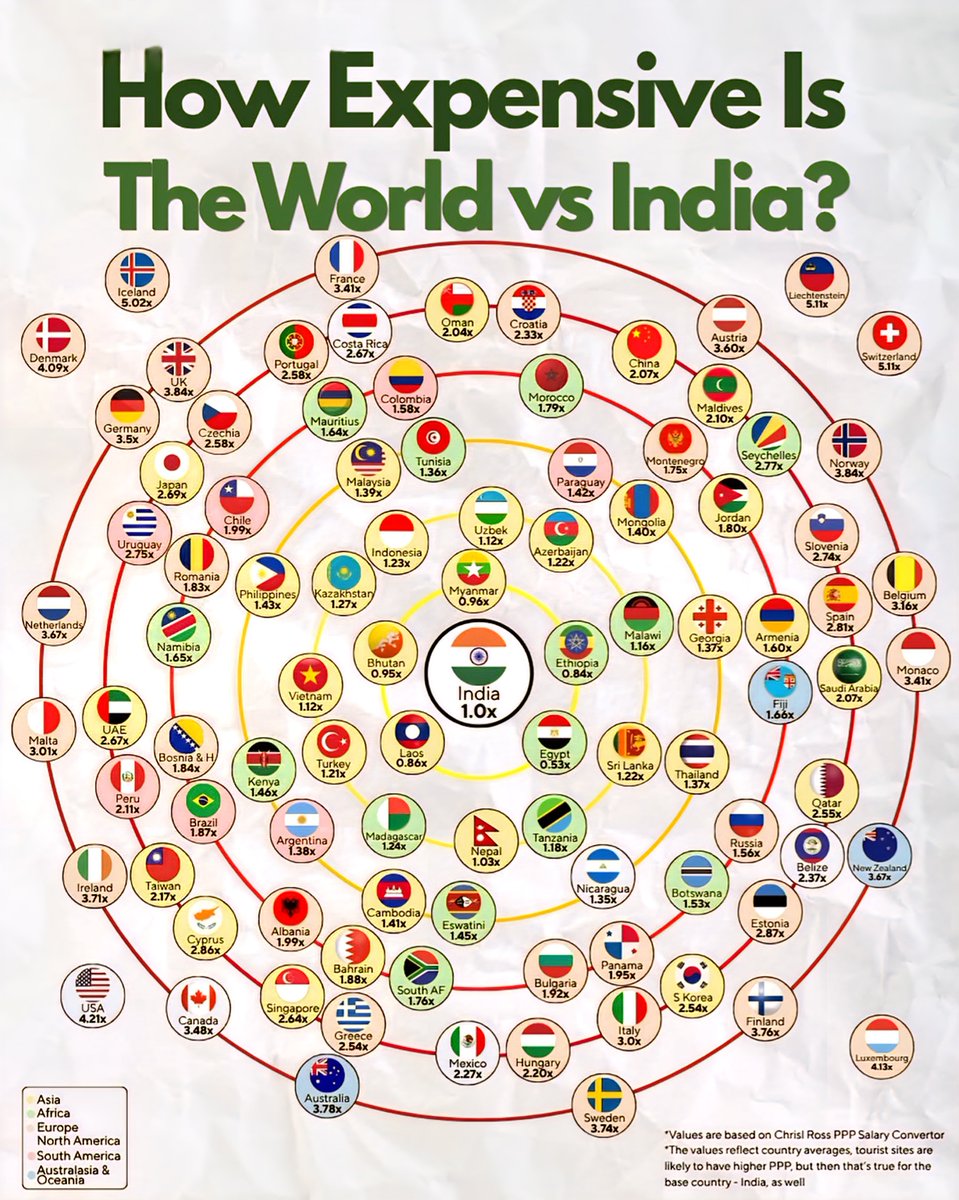 Countries like Brazil (1.87x) and Chile (1.99x) are more affordable relative to the high costs of Europe and North America, but still above India’s baseline. In the Middle East, the UAE (2.67x) and Qatar (2.55x) stand out for their luxury lifestyles, though the costs are comparatively lower than Switzerland or Scandinavian nations.