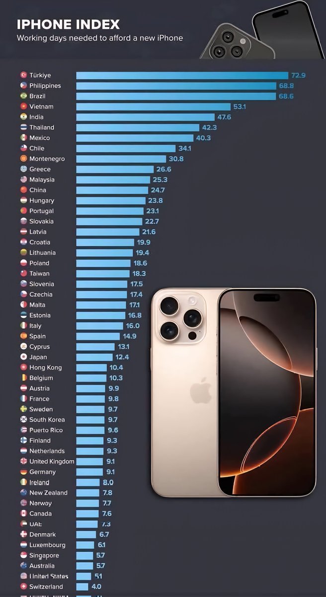 In these regions, it takes nearly a month of standard working days to purchase the iPhone. The significant disparity is driven by differing wages and living costs.