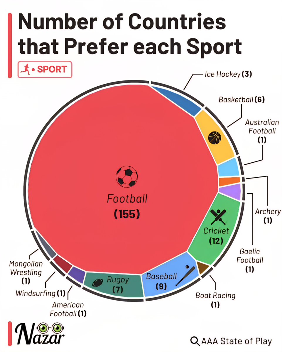While ice hockey (3 countries), American football (1 country), Australian Rules Football (1 country), archery, boat racing, Mongolian wrestling, windsurfing, and Gaelic football are played in limited regions, they nonetheless have dedicated local followings. These sports are often deeply embedded in the cultural identities of their respective nations, maintaining vibrant communities of players and fans.