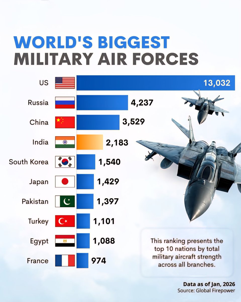 India commands a fleet of around 2,183 aircraft, reflecting substantial growth over the past few years. With a diverse mix of fighters, transport aircraft, and helicopters, India is actively expanding its air power through domestic manufacturing and international procurement. Strengthening its strategic airbase network and enhancing operational readiness have been key objectives amidst regional tensions and global alliances.