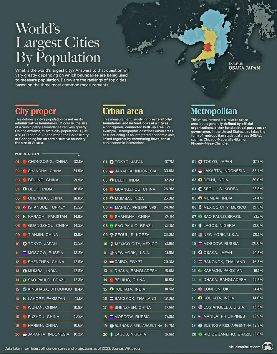 - City Proper (Administrative Boundaries): Focuses on the population within official city limits. For example, Beijing (21.9 million) and Karachi (14.9 million) fall under this category.