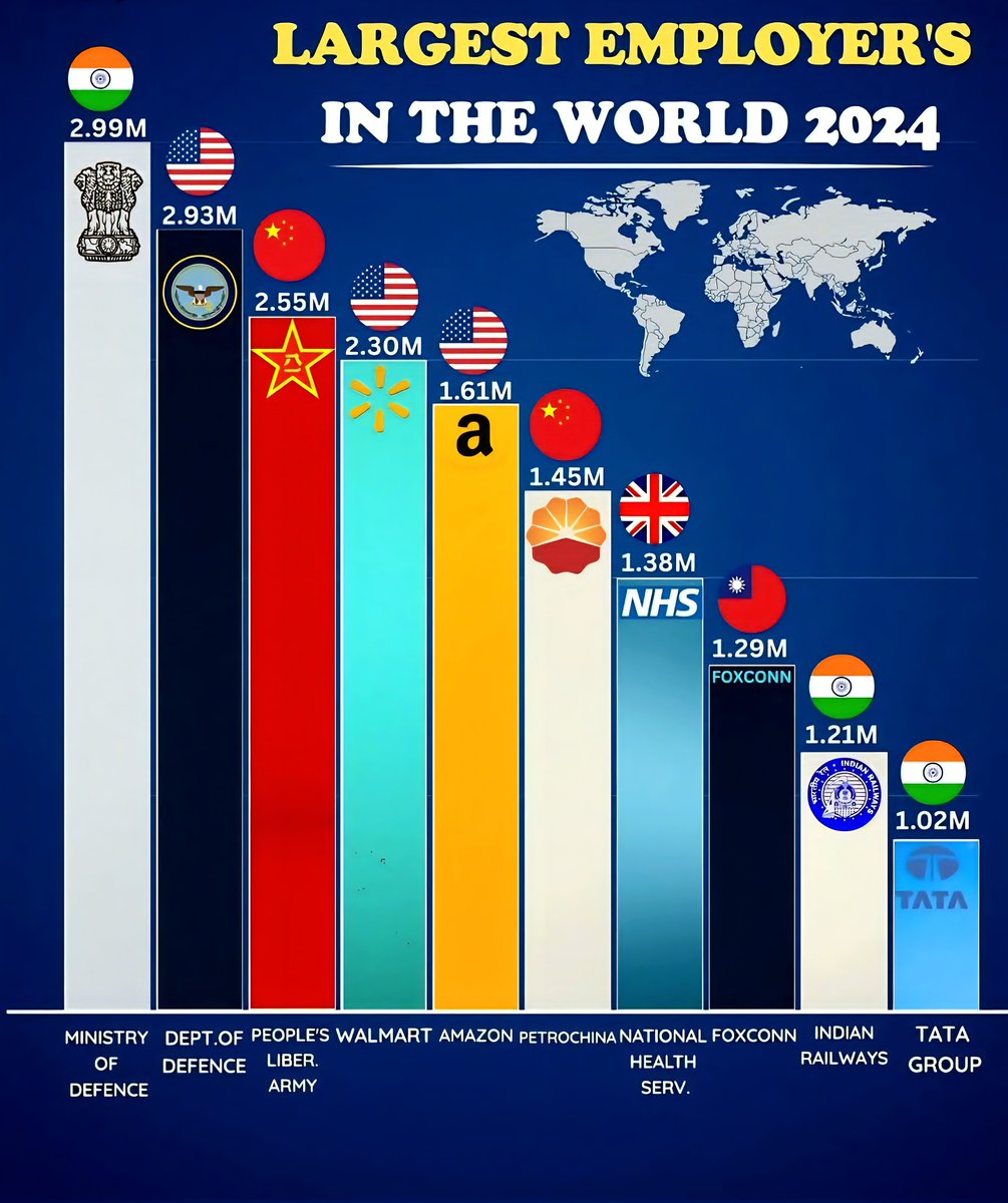 Leading the global employer rankings in 2025, the Indian Ministry of Defence proudly employs approximately 3 million individuals. As the backbone of India’s national security infrastructure, it encompasses a vast network of personnel across various branches, including the army, navy, and air force. The ministry’s extensive workforce is vital to maintaining peace and sovereignty in the region.