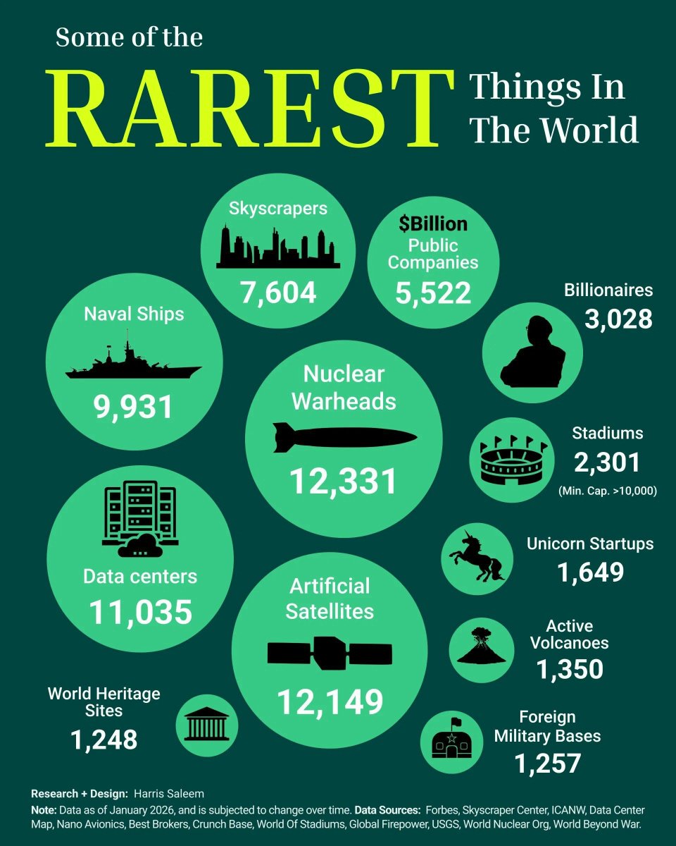 Source: Forbes, Skyscraper Center (CTBUH), ICANW, Data Center Map, Nano Avionics, Best Brokers, Crunchbase, World of Stadiums, Global Firepower, USGS, World Nuclear Organization, World Beyond War