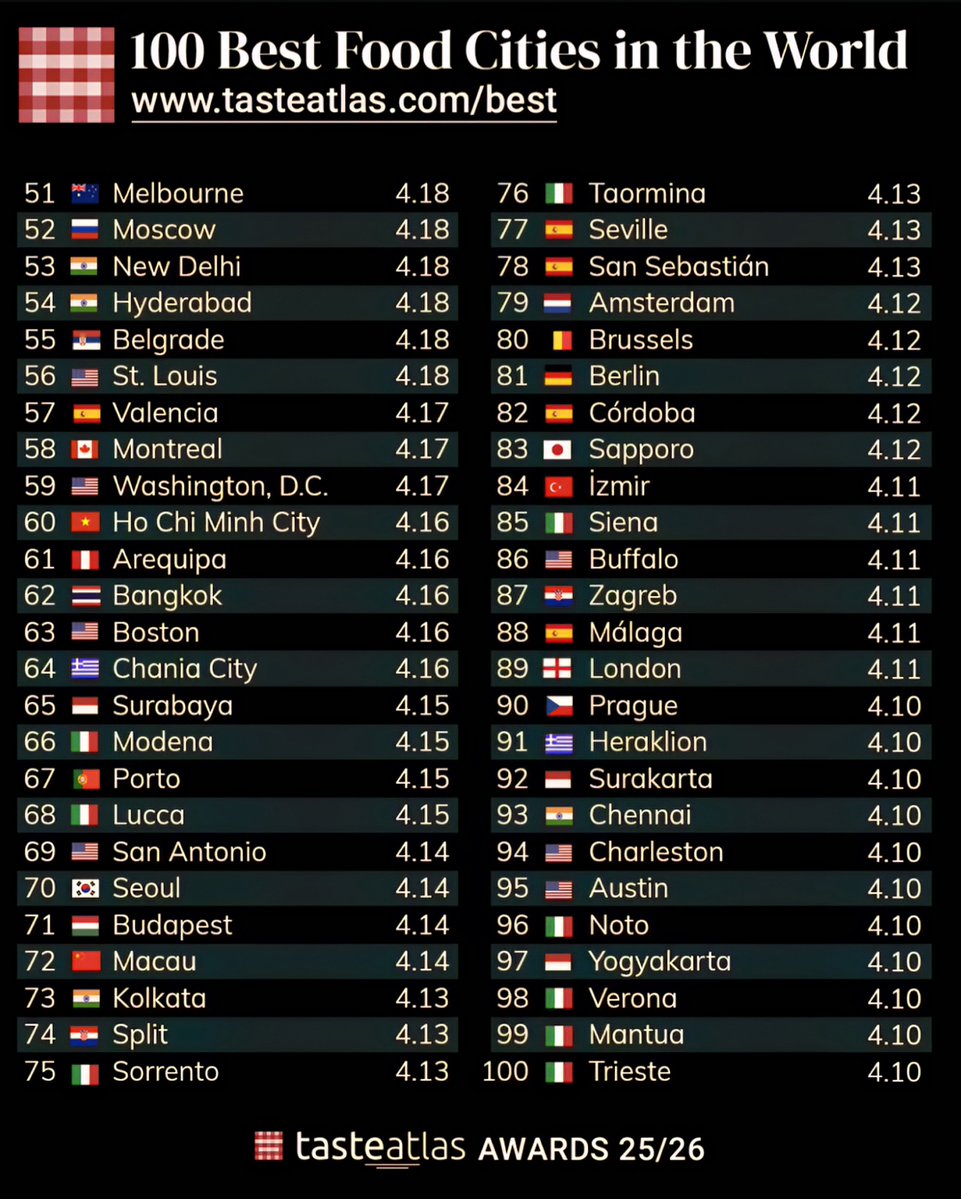 Further down the list, emerging food destinations like Yogyakarta, Surabaya, and Padang in Indonesia are gaining recognition for their authentic and vibrant local cuisines, earning ratings between 4.10 to 4.15 stars.