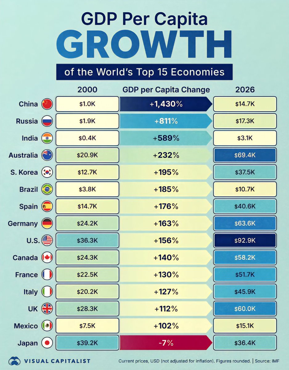 France’s GDP per capita grew from roughly $22,500 in 2000 to about $51,700 in 2025, realizing a 130% increase. Its diverse economy, strong tourism sector, and social welfare programs contribute to ongoing prosperity.