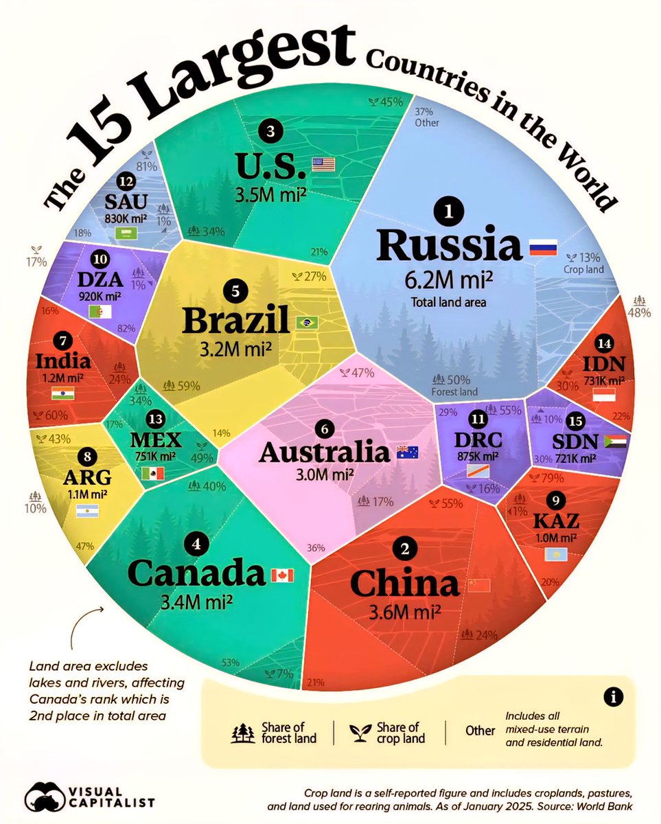 Note: While Canada ranks second globally in total area (including lakes and rivers), it is the fourth largest when excluding these inland waters. Crop land figures are self-reported and include croplands, pastures, and land used for livestock rearing, as reported in January 2025.
