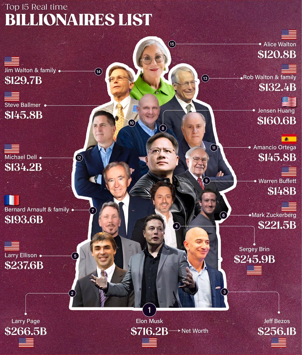 Leading the list is Elon Musk from the United States, with an astonishing net worth of $716.2 billion. His wealth is primarily driven by his pioneering roles at Tesla and SpaceX, which continue to reshape industries worldwide. Musk’s influence extends beyond automotive and space exploration—venturing into infrastructure with Neuralink and the Boring Company, making him a central figure in technological innovation.