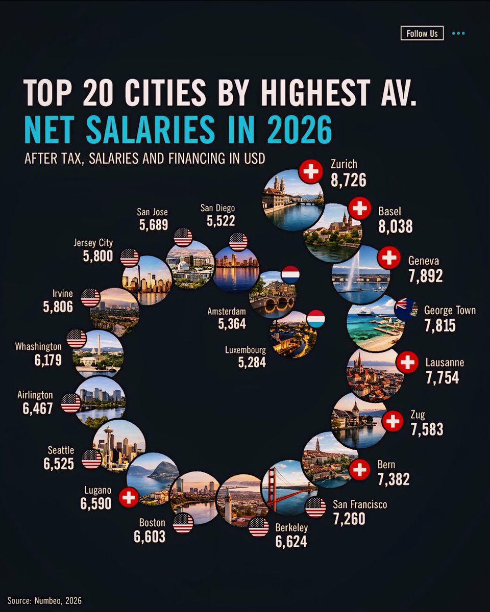 Switzerland retains its reputation for high wages, claiming five of the top ten spots. Zurich leads the pack with an impressive average net salary of $8,726, setting a new benchmark for global earning power. Basel and Geneva closely follow, with figures of $8,038 and $7,892 respectively, emphasizing the country’s reputation for prosperity and high standard of living. Notably, Lausanne, Zug, and Bern also feature prominently in the top ranks, reflecting Switzerland’s overall economic strength and focus on quality of life.