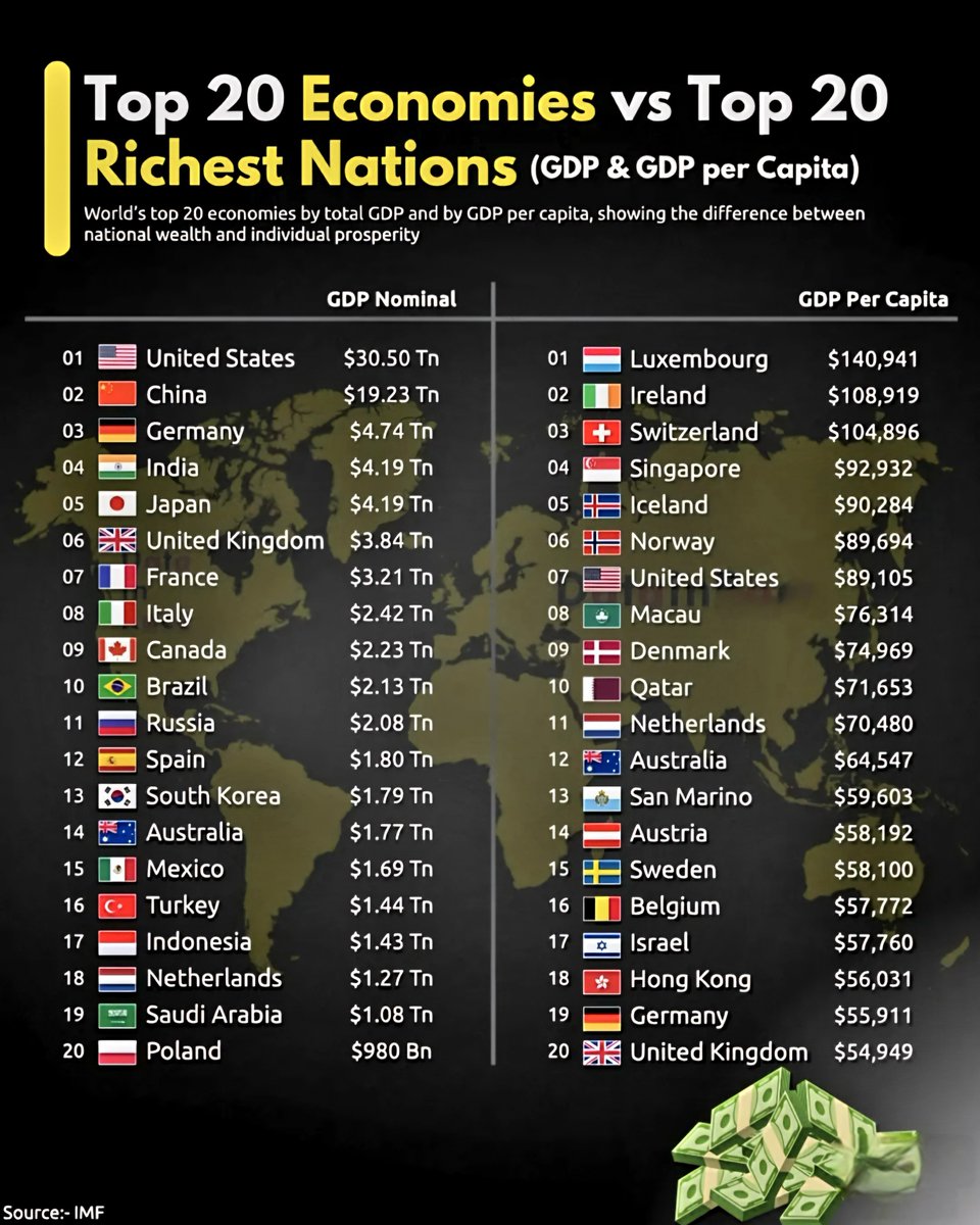 20 Most Economically Powerful Countries Versus 20 Wealthiest Nations: A Closer Look at GDP and GDP Per Capita