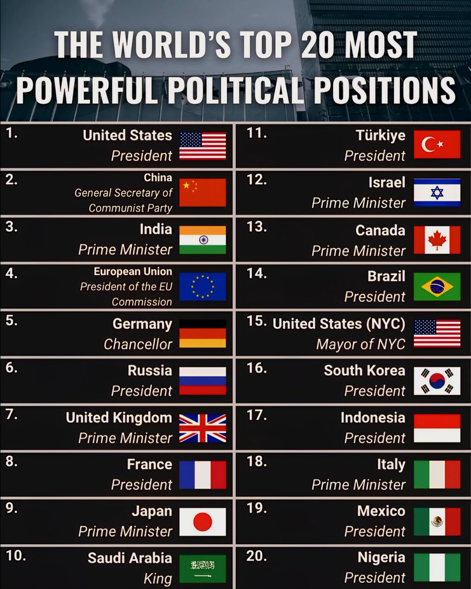 The Top 20 Most Influential Political Positions Worldwide in 2025