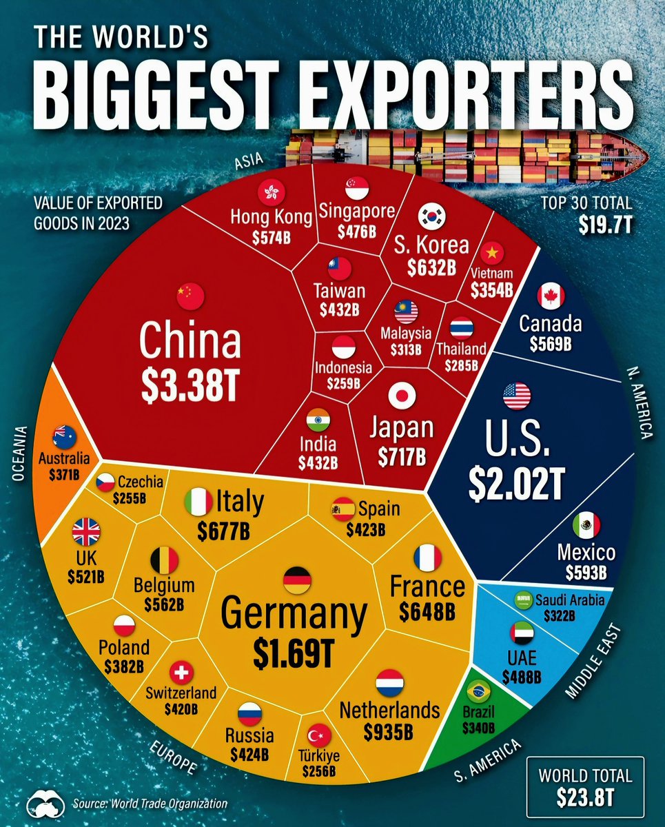 Germany leads Europe with an export value of $1.69 trillion, mainly in automotive, machinery, and chemical sectors. The Netherlands, Italy, France, and Belgium follow, with their exports spanning electronics, luxury goods, and pharmaceuticals. The UK’s exports stand at $521 billion, focusing on aerospace and financial services.