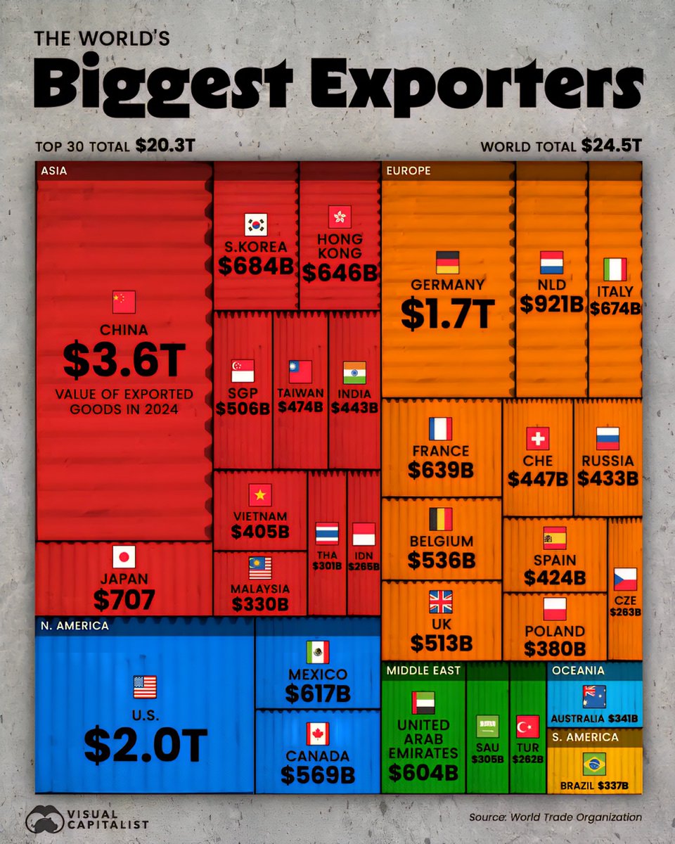 China remains the world’s top exporter in 2025, driving nearly $3.2 trillion in exports this year. Its extensive manufacturing infrastructure supports exports across electronics, machinery, textiles, and consumer goods. China’s strategic investments in logistics and technology have cemented its position as a vital trading hub, facilitating global supply chains and making it indispensable to international markets.