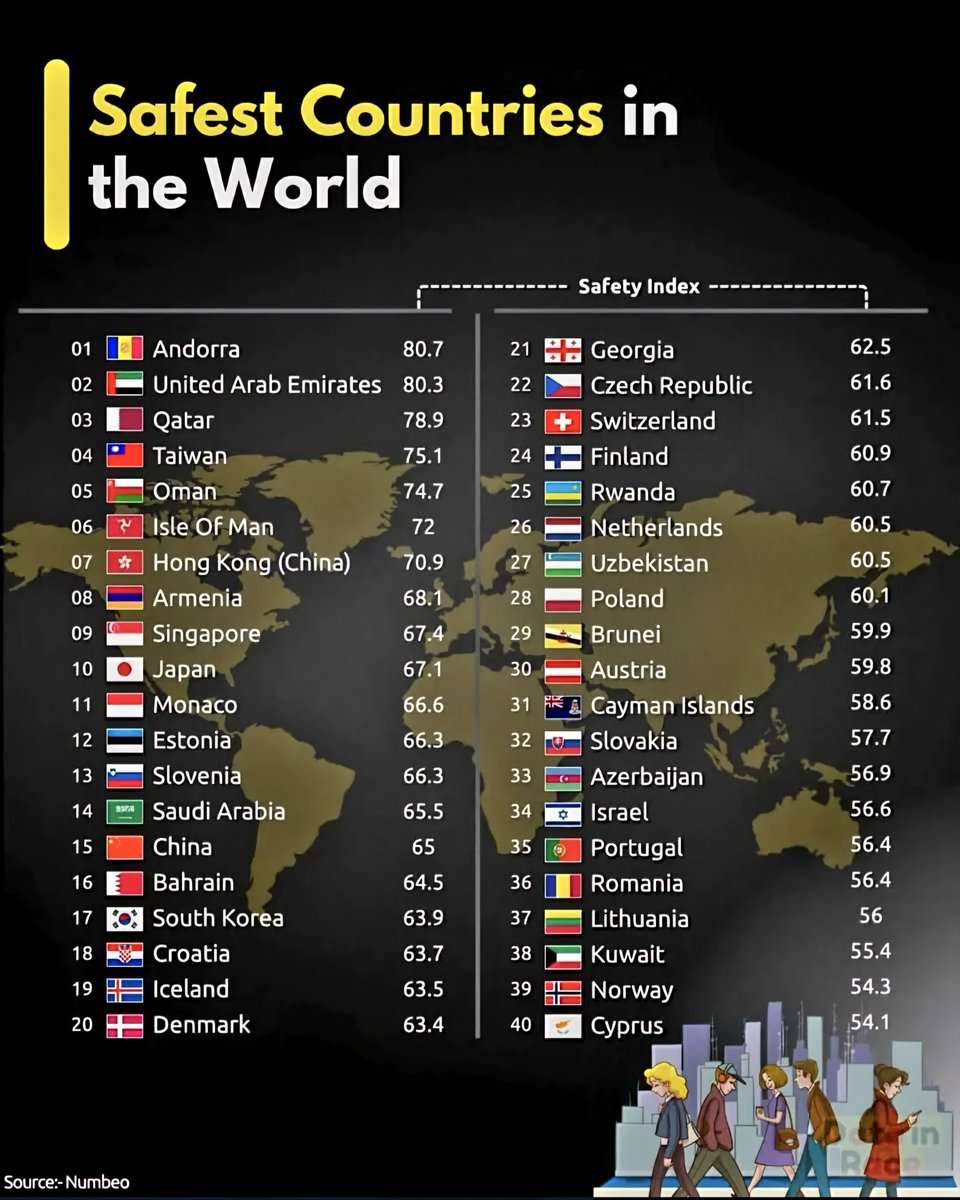 Note: The rankings are based on Numbeo’s Safety Index, which evaluates public perceptions of crime levels, police effectiveness, personal safety during day and night, and risks of theft, assault, vandalism, gun violence, and drug-related crimes.