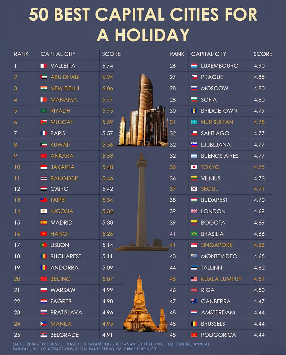 Note: These rankings are based on factors like hotel affordability, weather conditions, traffic of attractions, safety levels, restaurant density, and climate comfort as of 2025, as compiled by Bounce. Travelers should consider current travel advisories and personal preferences when planning their trips.