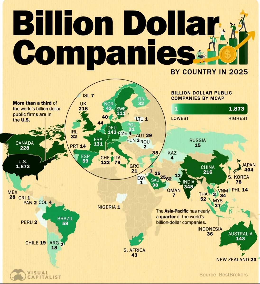 - Canada: Strong in natural resources and technology, Canadian companies are expanding globally, with renewable energy and AI firms crossing the billion-dollar mark.