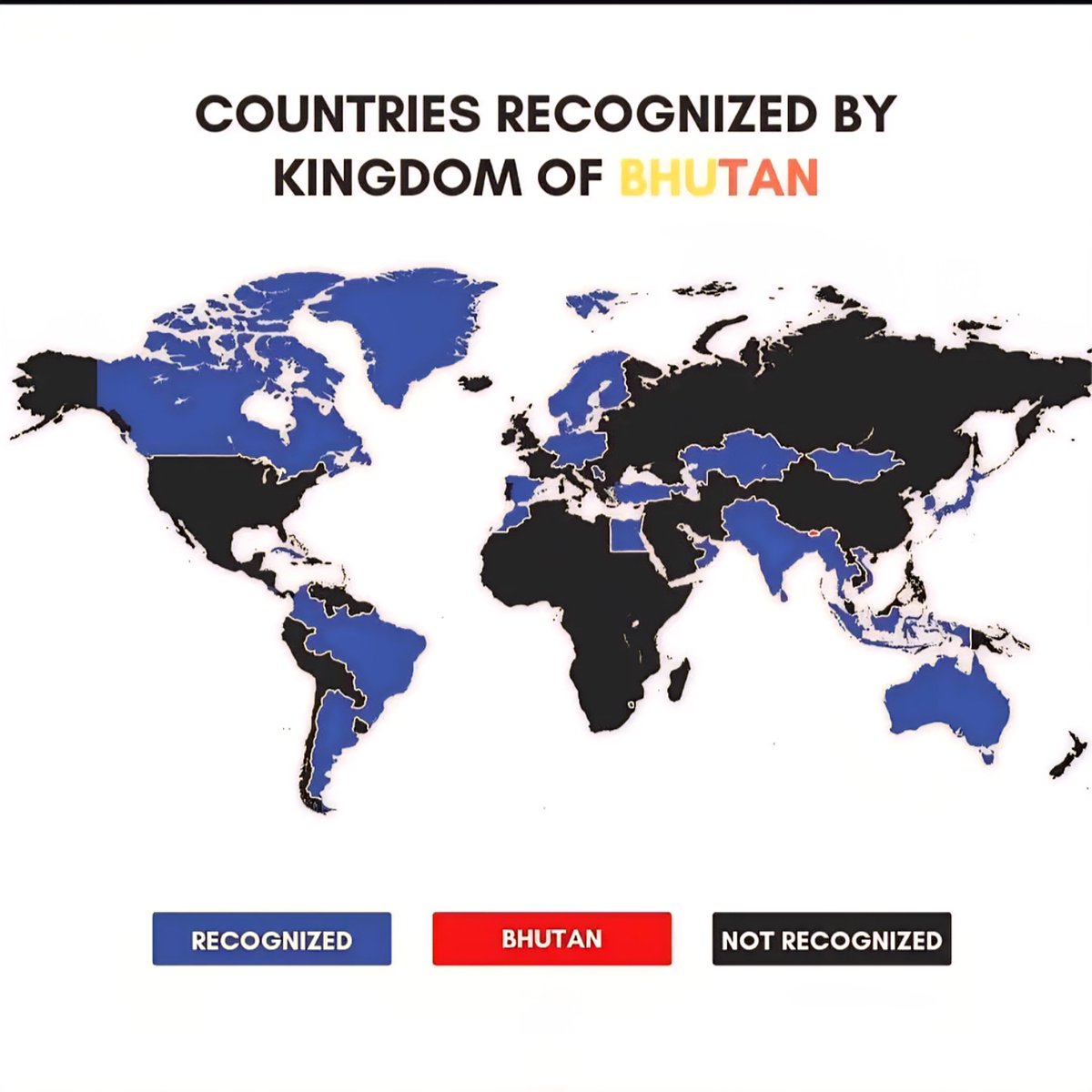 The map also depicts countries that Bhutan does not officially recognize. This includes nations with which Bhutan has no formal diplomatic or consular relations. Generally, these countries are marked in black. Bhutan tends to adopt a cautious approach regarding recognition, often prioritizing diplomatic relations based on shared interests, regional stability, and international norms.