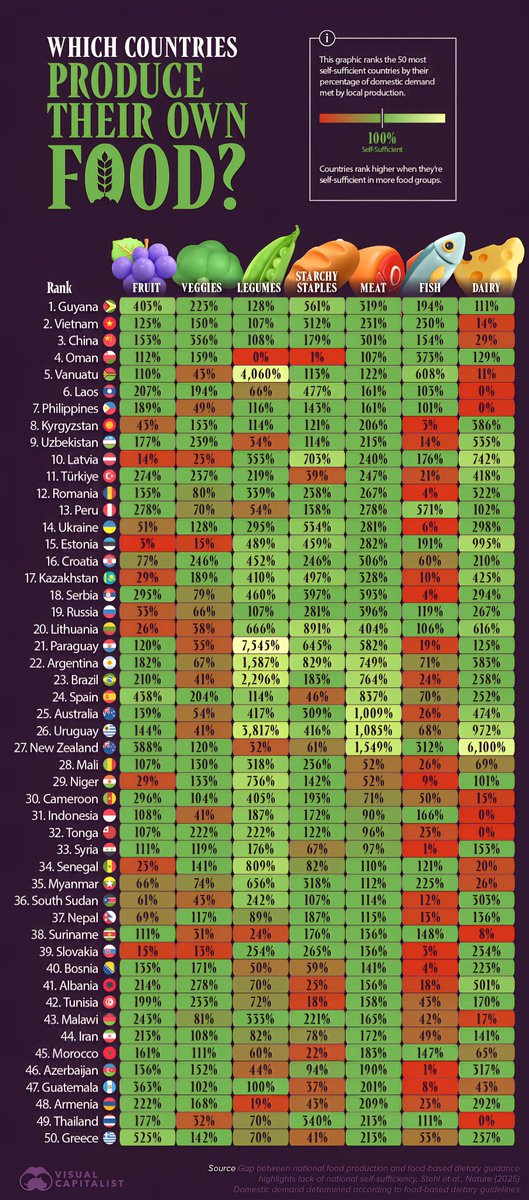 China and Vietnam come remarkably close to self-sufficiency, covering six of the seven essential food groups. These countries have made significant investments in their agriculture and aquaculture industries, allowing them to produce most of their required food. However, they still depend on imports to fill specific gaps, often in niche or premium markets, or for certain products not suitable for domestic farming.