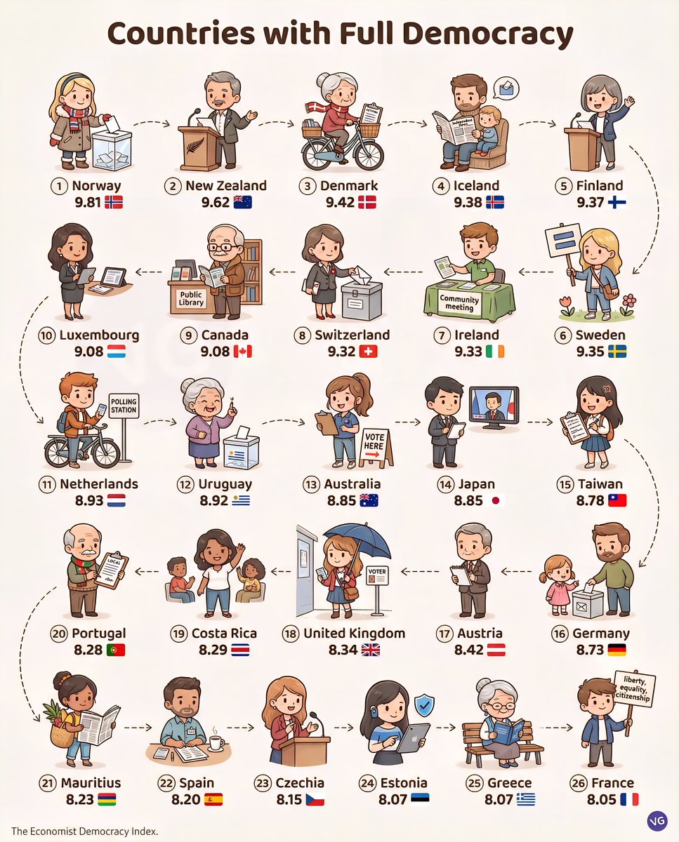 France’s political stability, strong civil liberties, and active public discourse sustain its prominent democratic standing.