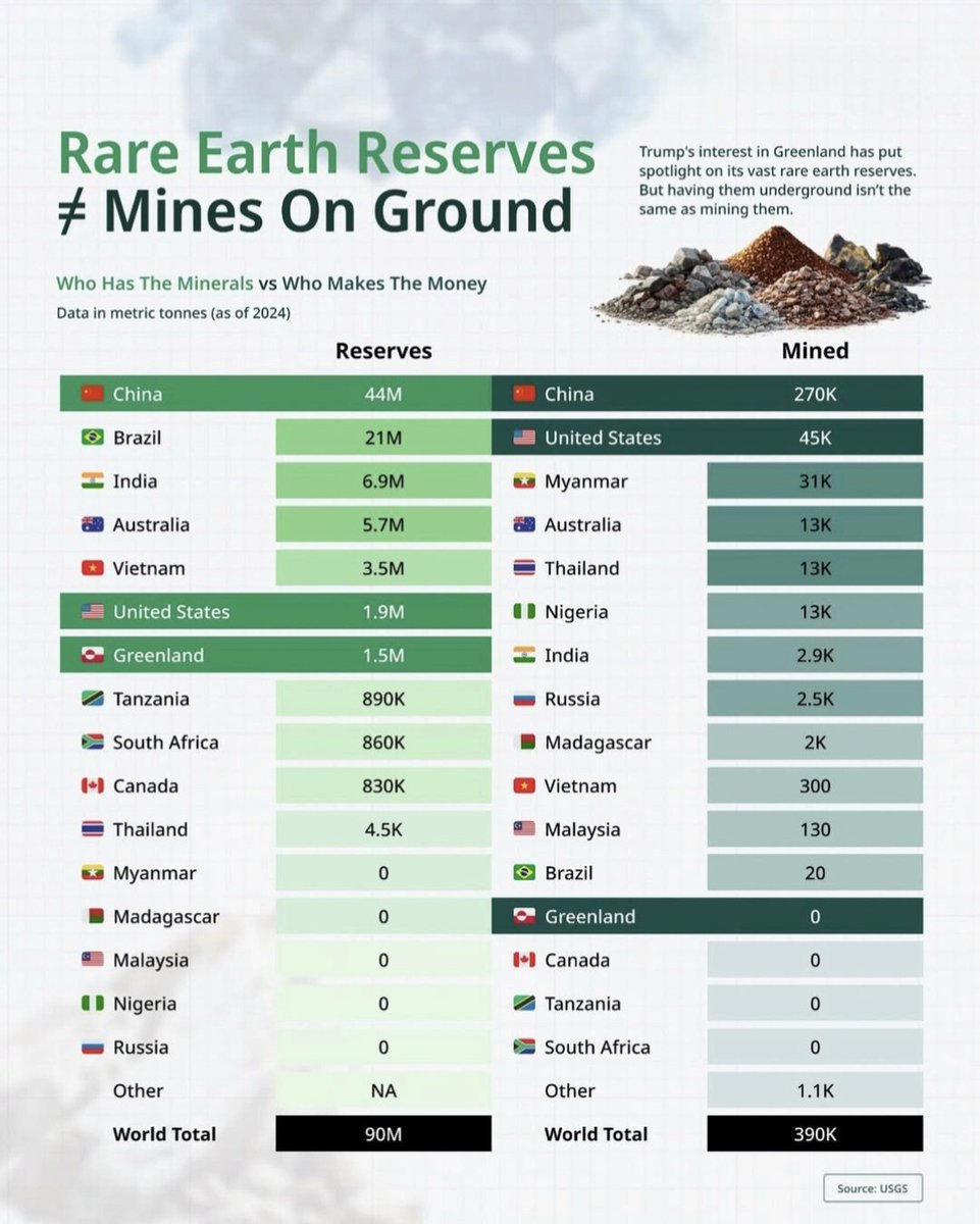 The United States has approximately 1.9 million tonnes of reserves but mines only about 45,000 tonnes per year, indicating potential for increased exploitation. Greenland’s reserves stand at about 1.5 million tonnes, but extraction remains minimal. These regions are being reassessed for their strategic importance amidst rising global demand.