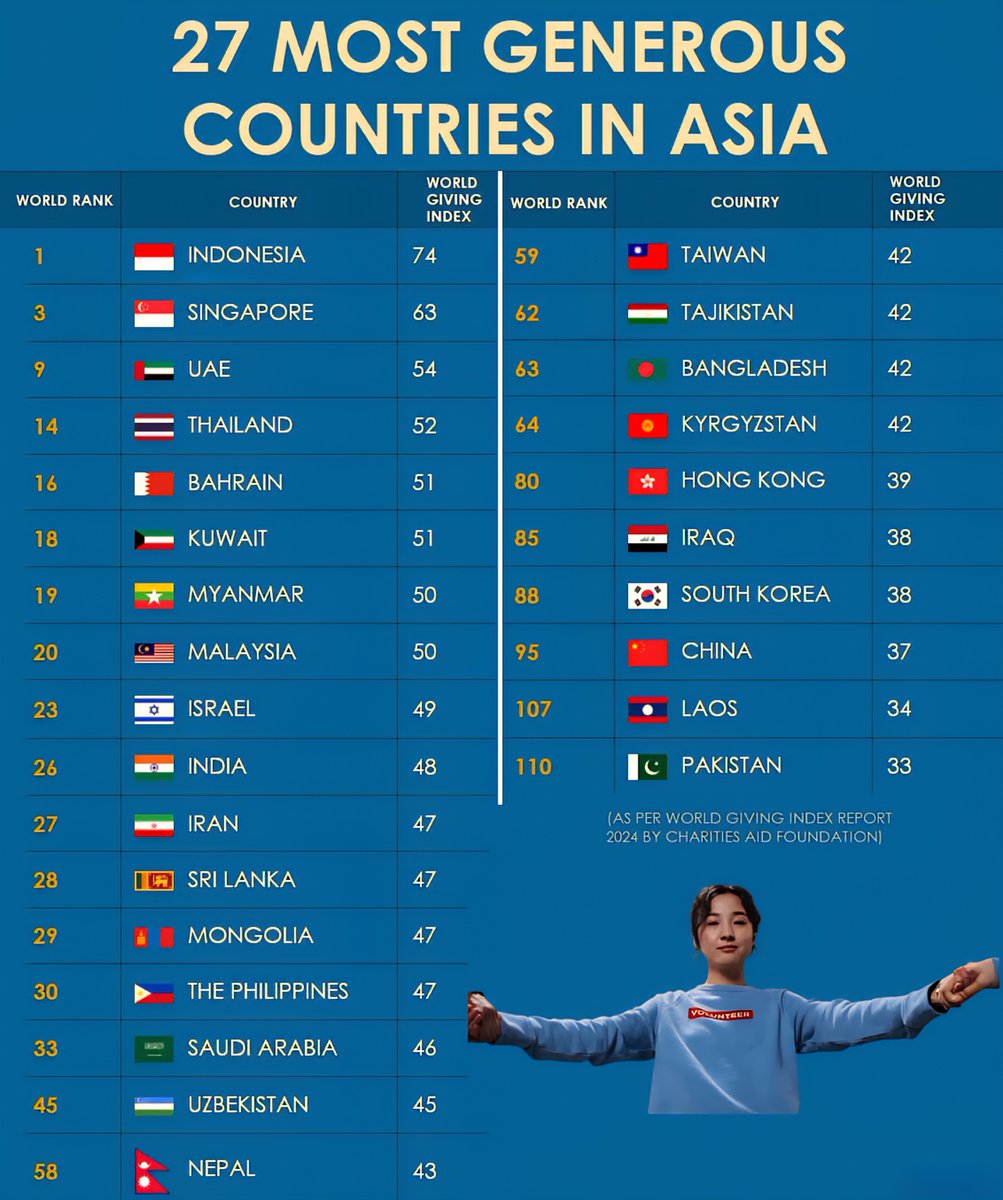 Indonesia emerges as the most generous country this year. Its vibrant community-centered culture and deep-rooted religious values encourage widespread charitable giving and volunteering. With a diverse population embracing mutual support, Indonesia’s people actively participate in community outreach and help strangers without hesitation. They lead in both donations and spontaneous help, demonstrating an extraordinary sense of communal responsibility.