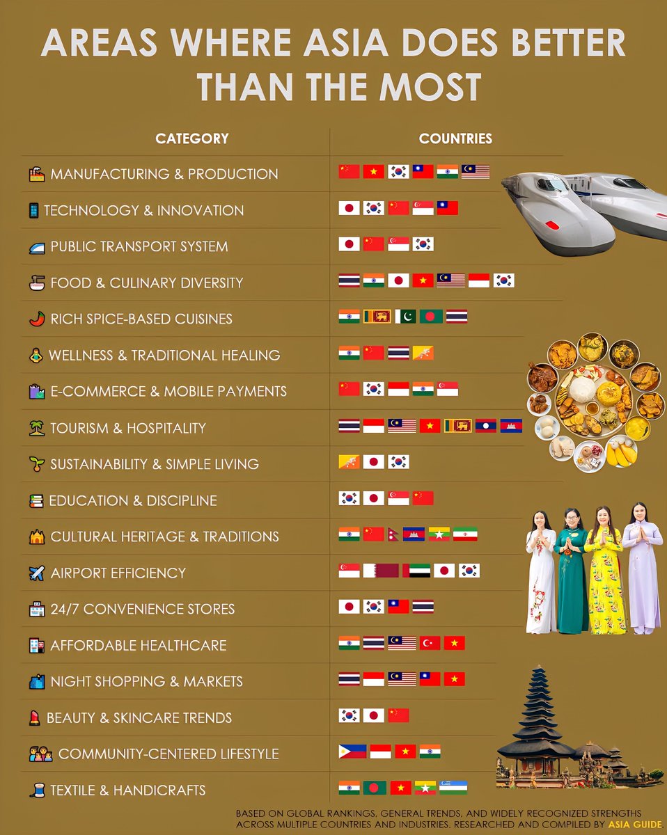 This comprehensive list underscores Asia’s pervasive strengths across various industries and cultural domains, reaffirming its global leadership in innovation, tradition, and sustainability in 2025.