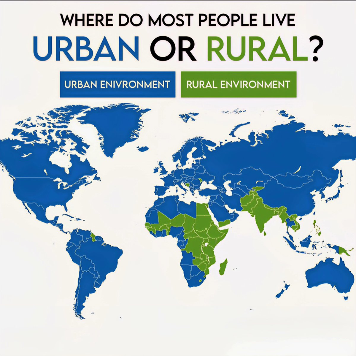 The world map vividly illustrates the current landscape of urban and rural living patterns in 2025, highlighting dense metropolitan areas and expansive rural regions.