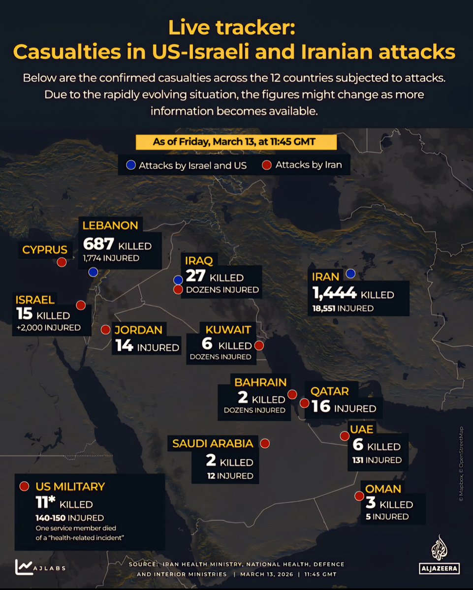 Source: Iran Health Ministry, National Health, Defense, and Interior Ministries, updated as of March 13, 2026.