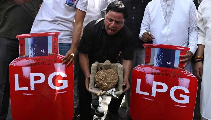 Protesters from India’s opposition Congress party demonstrated in New Delhi on March 13, 2026, protesting against rising fuel prices and shortages of liquefied petroleum gas (LPG).