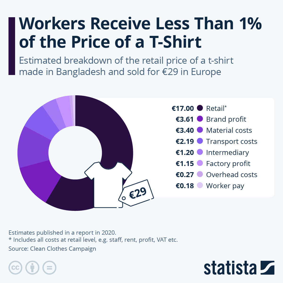 Clean Clothes Campaign’ın verilerine göre, Avrupa’da 29 Euro’ya satılan bir tişörtün fiyatı üzerinden yapılan analiz, işçilerin bu miktarın sadece yüzde bire tekabül eden bir kısmını kazandığını gösteriyor. Bangladeş’teki işçiler, bu küçük miktar için yoğun bir şekilde çalışırken, büyük giyim markaları ve perakendeciler büyük karlar elde ediyor.