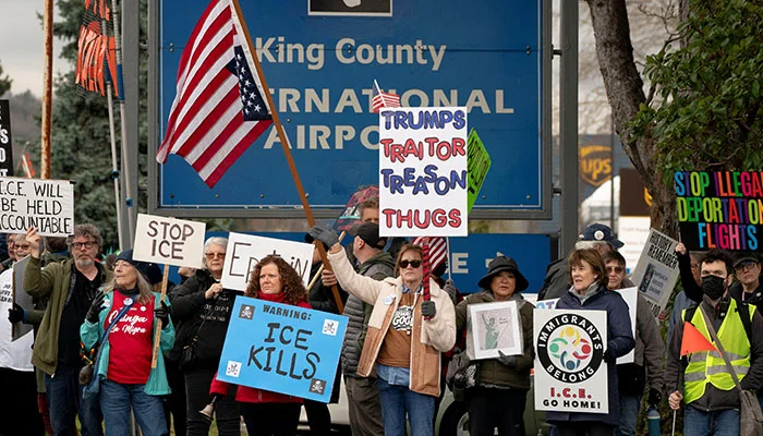 People gather at King County International Airport in Seattle, Washington, on January 15, 2026, to protest against deportation flights operated by U.S. Immigration and Customs Enforcement (ICE). — Reuters