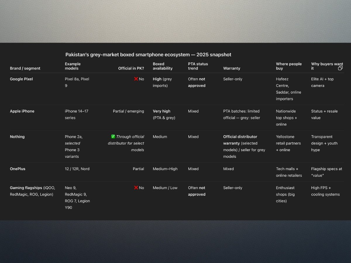A growing number of Pakistani consumers are purchasing smartphones outside official local launches. Sealed Google Pixels, Nothing phones, OnePlus flagships, ROG and Redmagic gaming devices, and boxed iPhones are being sold through parallel imports and specialized resellers. This provides faster access to niche models but also increases the risk of regulatory issues, warranty problems, and repair uncertainties.