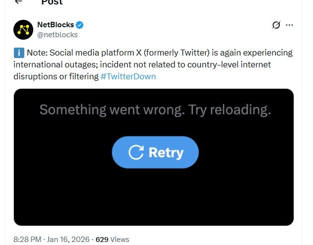 NetBlocks posted on X, stating, “X is experiencing international outages again; this incident is not related to country-specific internet disruptions or filtering.”